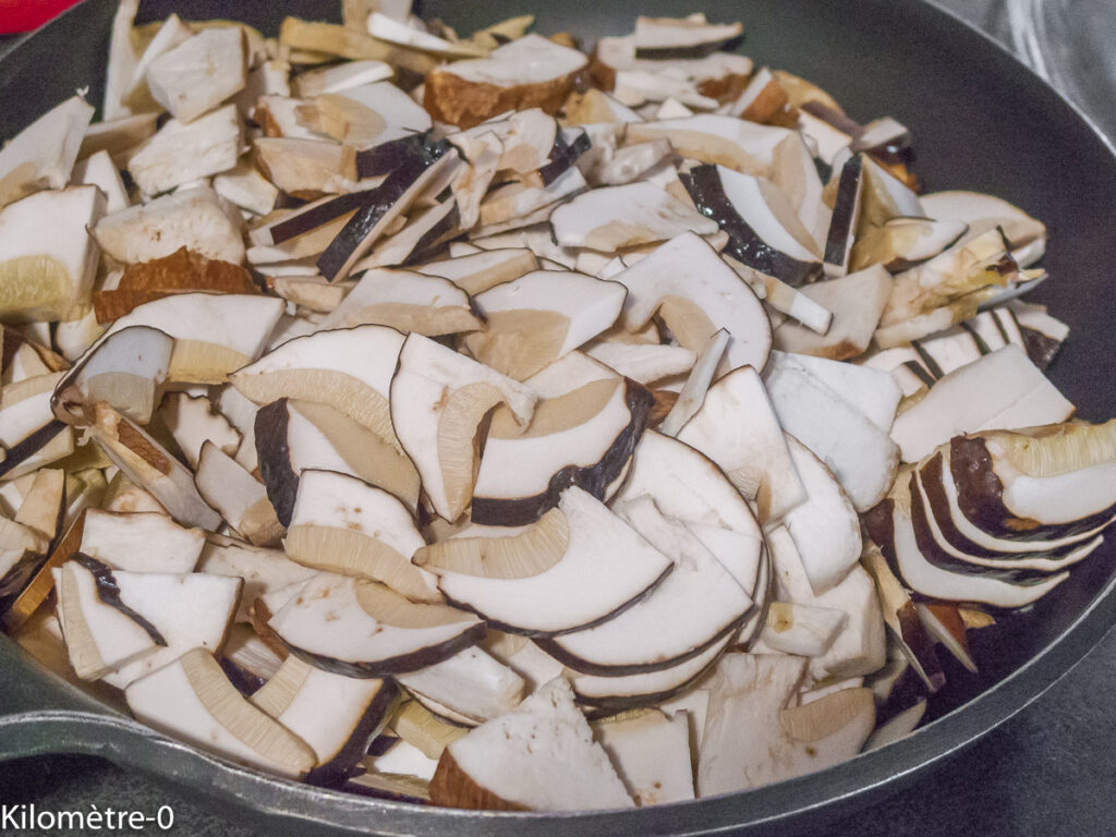 Essuyez avec un linge légèrement humide ou un essuie tout les champignons. Coupez-les en fines lamelles et versez-les dans une poêle avec un peu d’huile d’olive ou du beurre et un peu de sel. Couvrez et laissez-les cuire environ 15 minutes. S’ils dégagent de l’eau à la cuisson, retirez le couvercle et laissez-les cuire jusqu’à ce qu’il n’y ait plus d’eau de végétation.