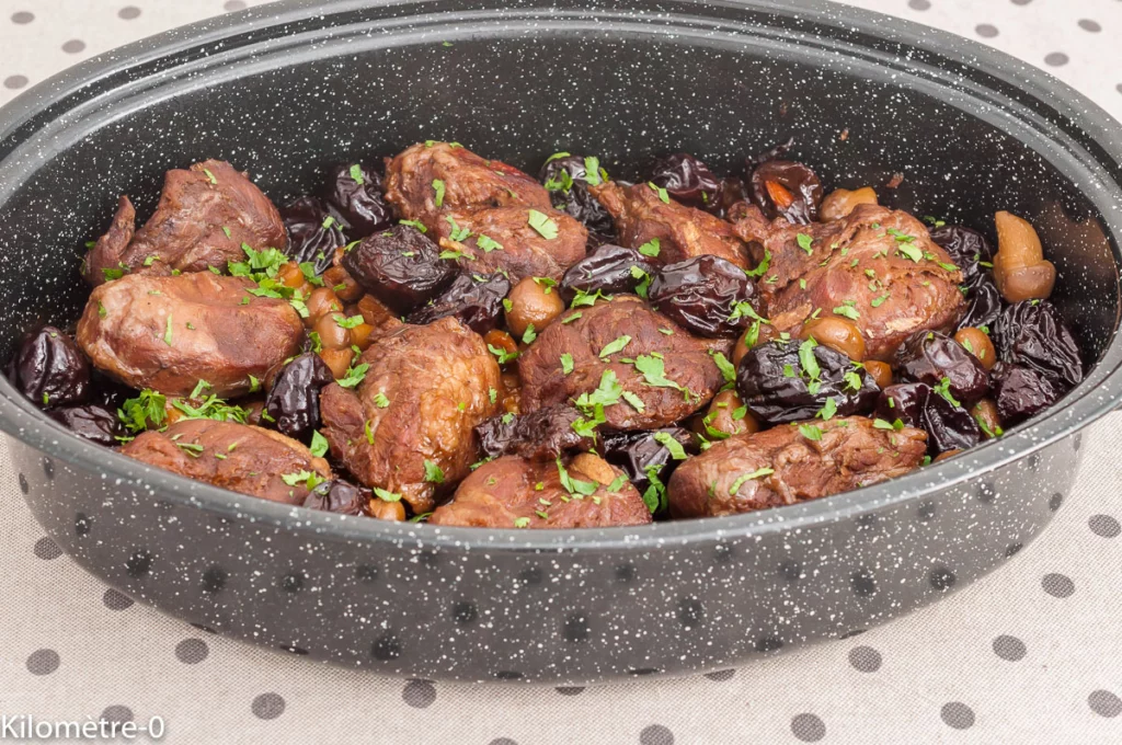 Je l’ai laissé cuire très longtemps car j’aime bien quand la viande est très fondante. Il faut donc ne mettre les pruneaux et les champignons que beaucoup plus tard que la viande.