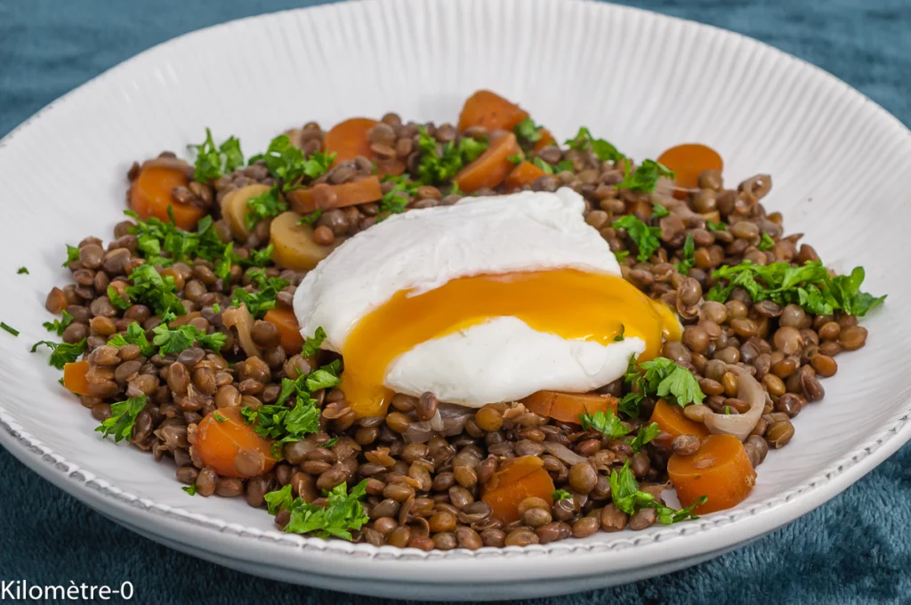 Lentilles vertes aux œufs pochés - Recette Kilomètre-0