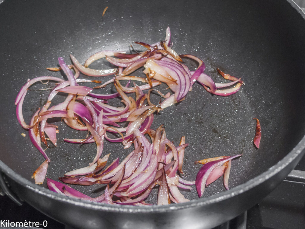 Epluchez un oignon et faites-le revenir dans un peu d’huile d’olive.