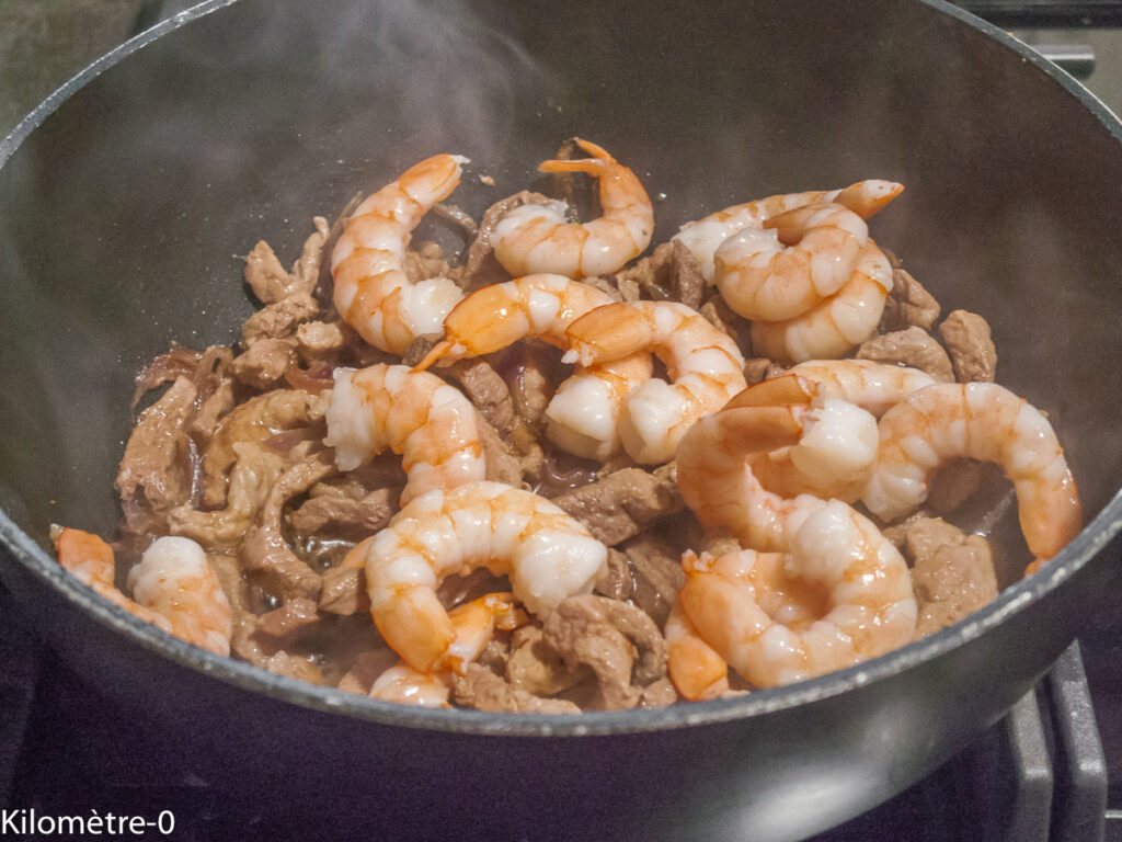 Quand la viande est dorée, ajoutez les crevettes et cuisez 3 minutes en mélangeant.