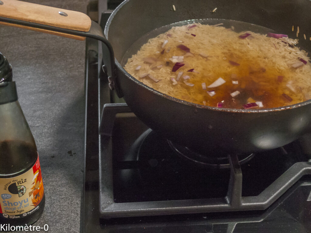 Recouvrez d’eau (deux fois à deux fois et demi le volume de riz), versez la sauce soja et laissez cuire sans remuer jusqu’à totale absorption du riz (environ 20 minutes).