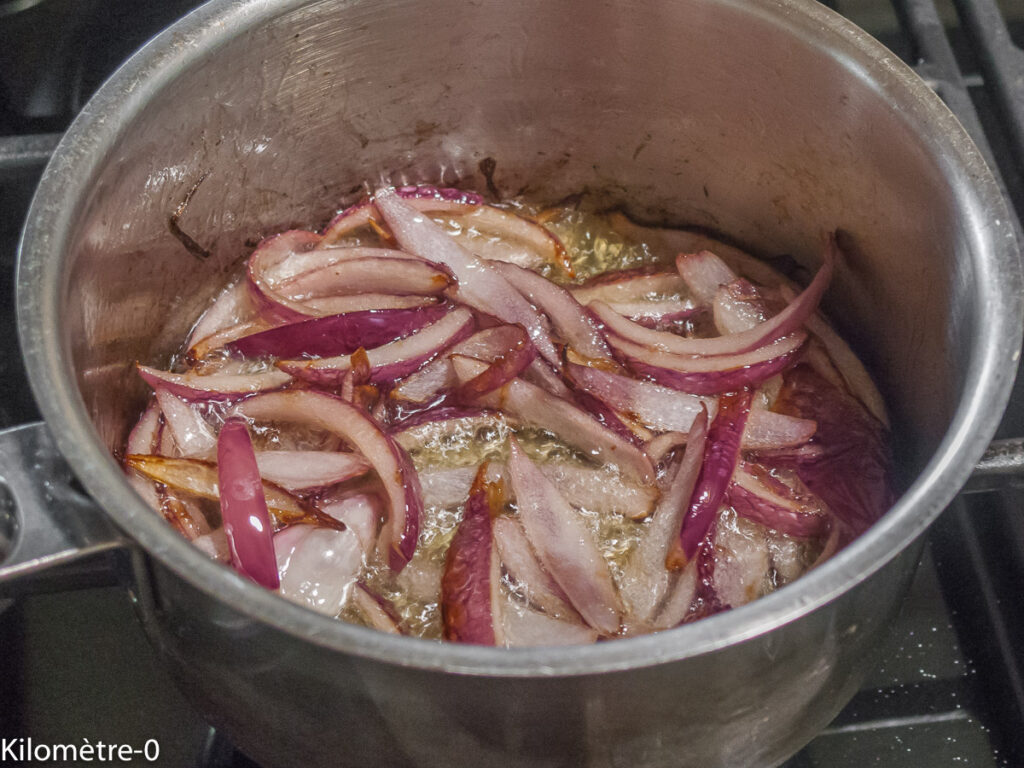 Epluchez le dernier oignon, coupez-le en lamelles et faites-le frire dans l’huile de tournesol (ou une autre huile de friture).