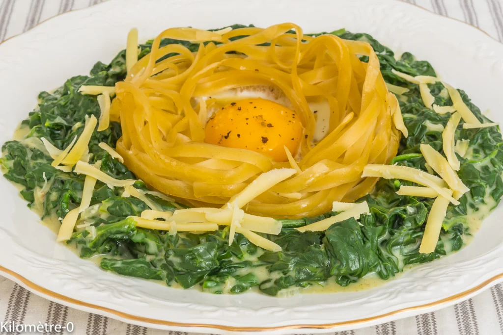 Oeuf dans un nid de pâtes sur un lit d’épinards