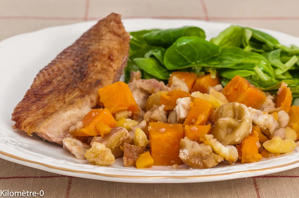 Je l’avais coupée en deux car on n’était que deux quand même. On a eu un beau reste pour le lendemain. Quand on aime, on est plutôt content à l’idée d’en remanger. Je l’ai accompagnée de patates douces et de châtaignes. C’est simple et bien de saison !