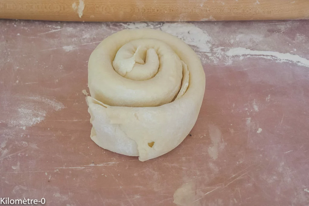 Roulez-la en escargot et étalez-la de nouveau sur une feuille de papier sulfurisé.