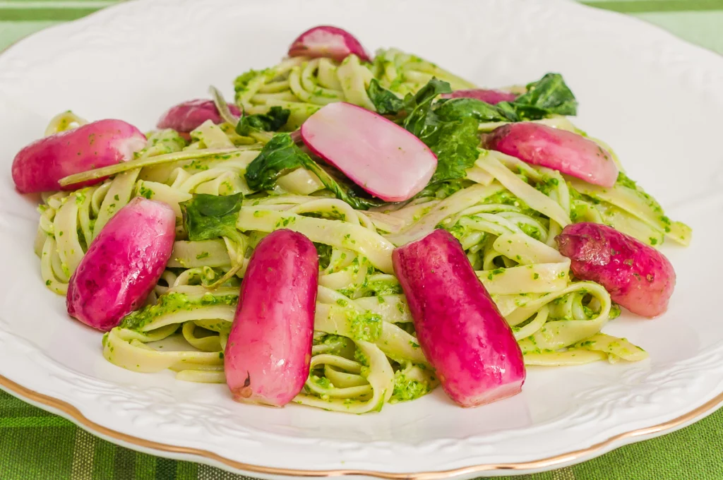 Photo de recette végétarienne, healthy,  pâtes, fanes de radis, radis, pesto, bio, facile, enti gaspi, économique, Kilomètre-0, blog de cuisine réalisée à partir de produits de saison et issus de circuits courts
