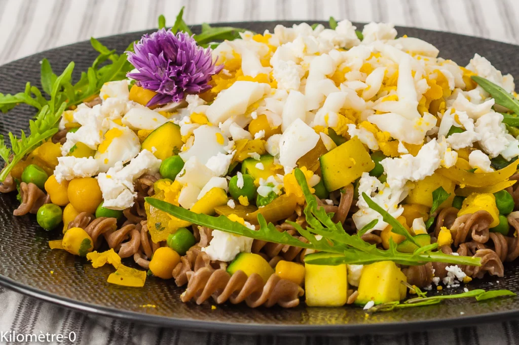 Pâtes et pois chiches aux légumes, œufs et fêta - Recette Kilomètre-0
