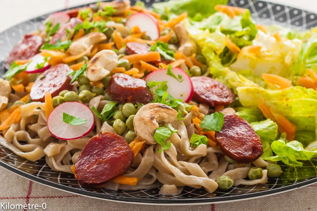 Pâtes fraiches au chorizo, petits pois et carottes - Recette Kilomètre-0