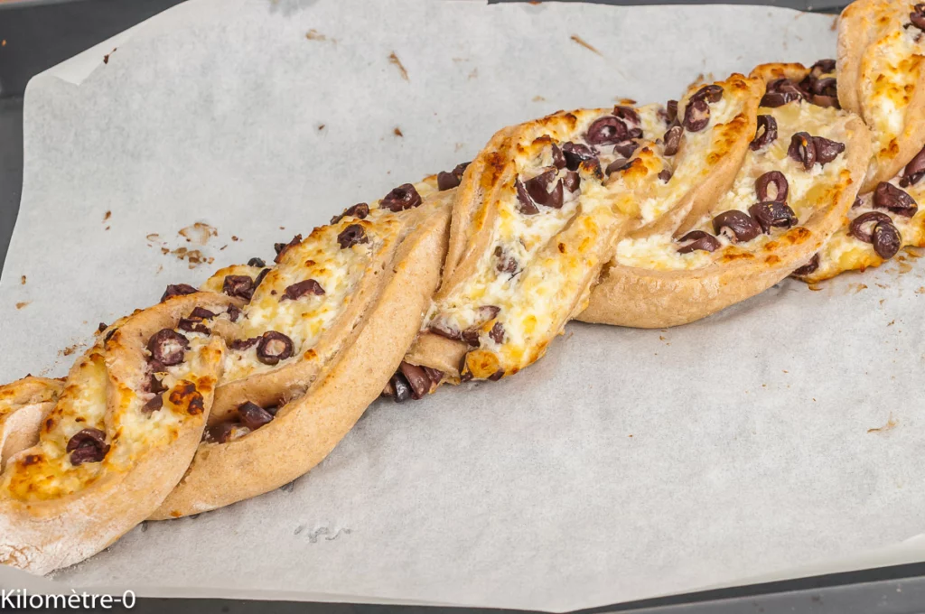 Quand je fais des pizzas, très souvent je les fais par deux car je prépare 1 kg de pâte. Ma première m’a permis d’utiliser les fins de frigo et celle-ci de proposer un apéro végétarien aux enfants. Cette pizza a beaucoup plu et tressée ainsi, elle fait son petit effet.