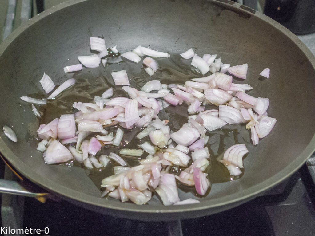 Epluchez l’oignon, émincez-le et faites-le revenir dans une grande poêle jusqu’à ce qu’il soit translucide.