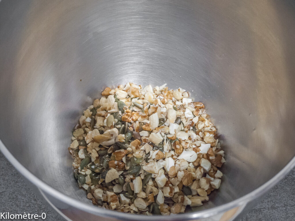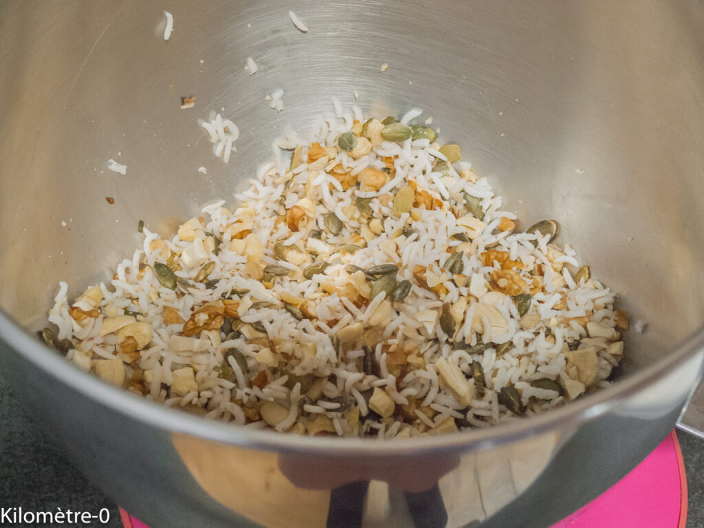 Ajoutez les graines de tournesol avec les noix et noix de cajou. Mélangez.