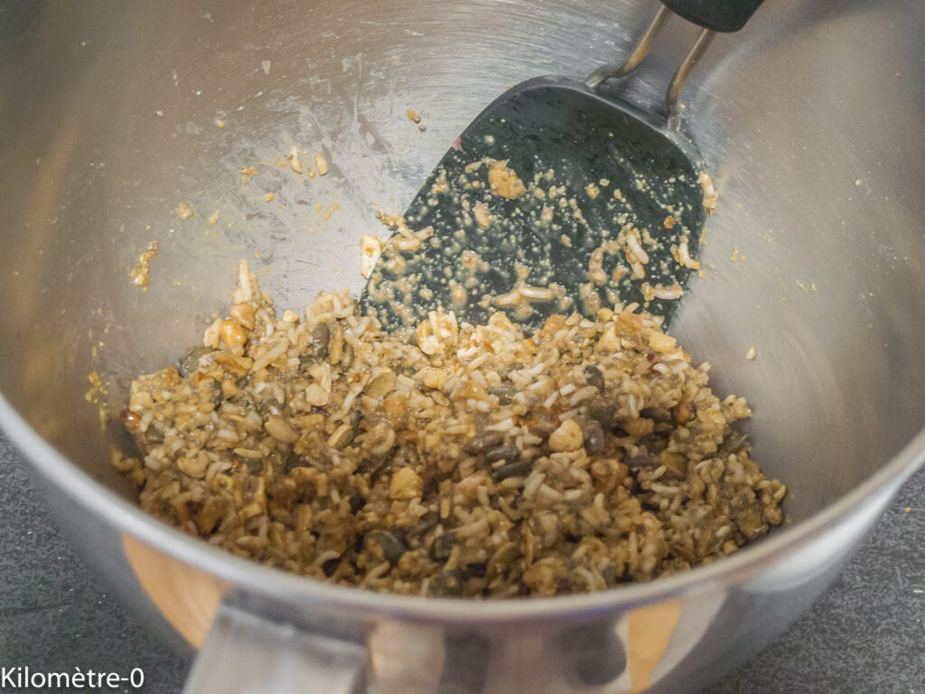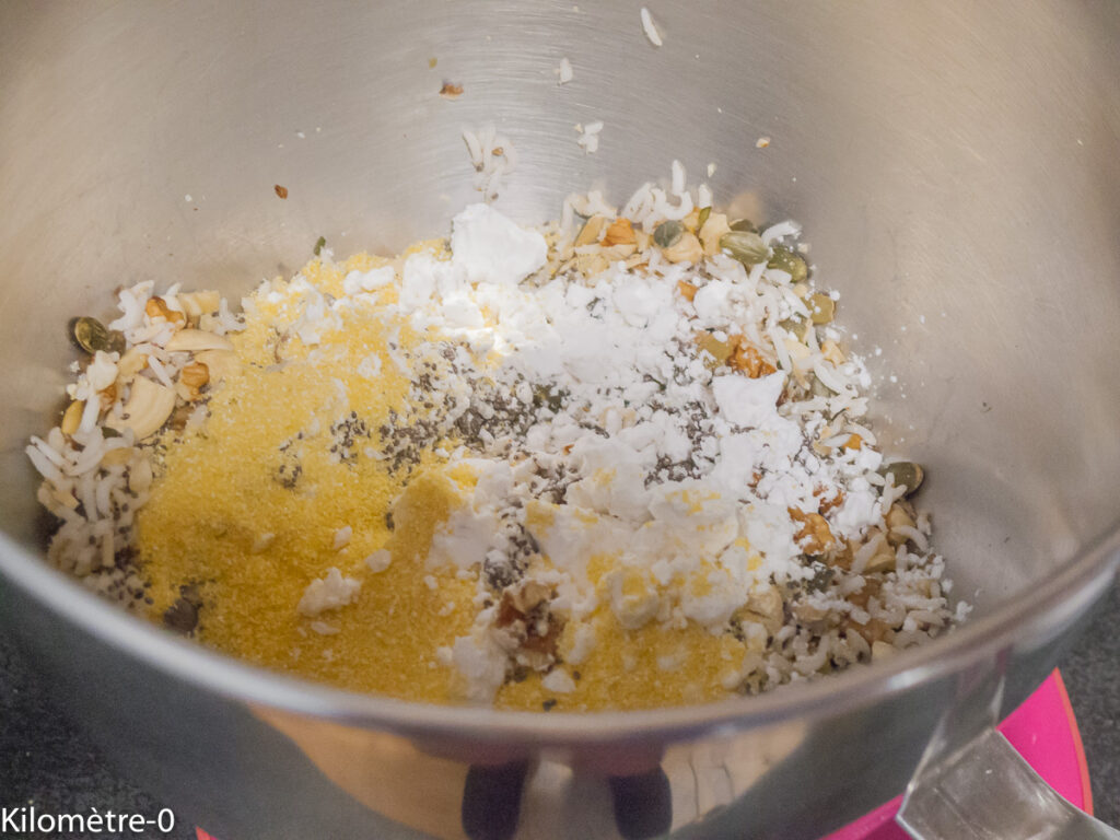 … et les autres ingrédients secs (riz, graines de chia, polenta, fécule, cumin), mélangez.