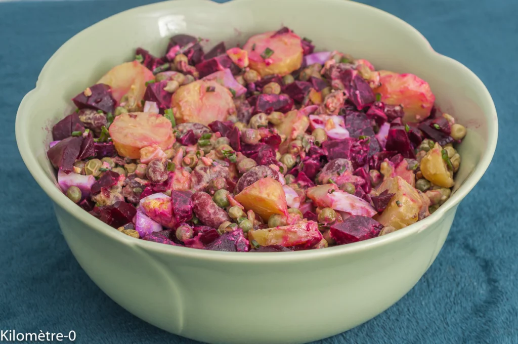 Salade de betteraves aux petits pois, pommes de terre nouvelles, oeufs, haricots rouges et ciboulette - Recette Kilomètre-0