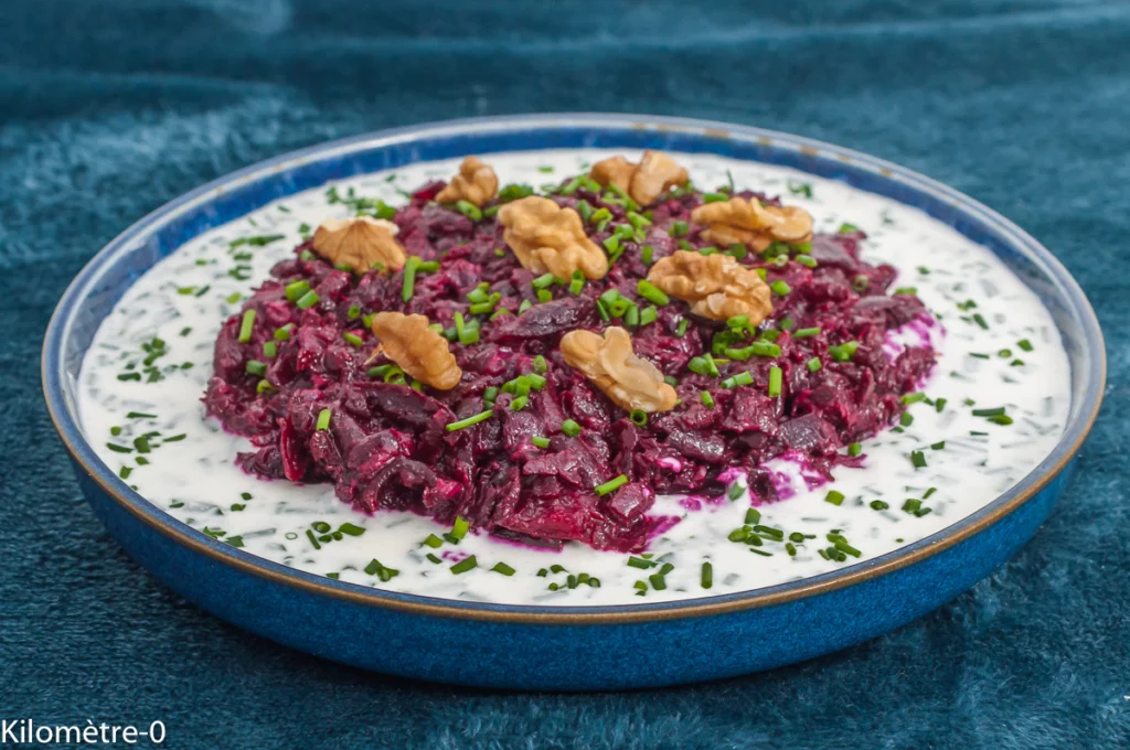 Salade de betteraves rouges aux noix et à la sauce fêta - Recette Kilomètre-0