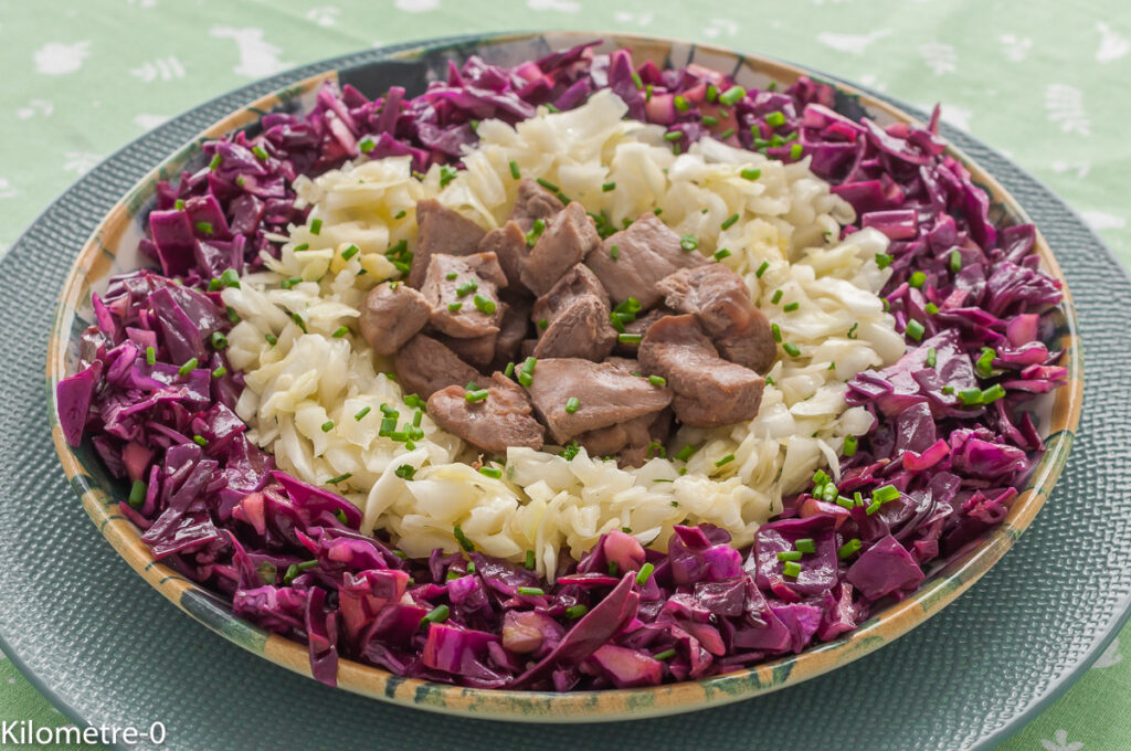 Photo de recette de salade, salade composée, hiver, automne, chou rouge, chou blanc,  canard, viande, légumes, chou, healthy, léger,  Kilomètre-0, blog de cuisine réalisée à partir de produits de saison et issus de circuits courts