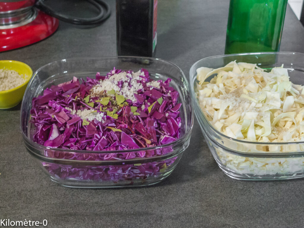 Mélangez le chou blanc avec 2 cs de vinaigre blanc et 1 cs de gros sel.