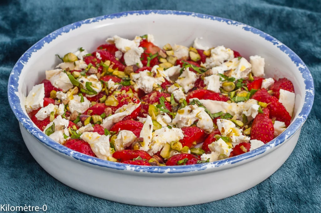 Salade de fraises au fromage de chèvre frais et aux pistaches - Recette Kilomètre-0
