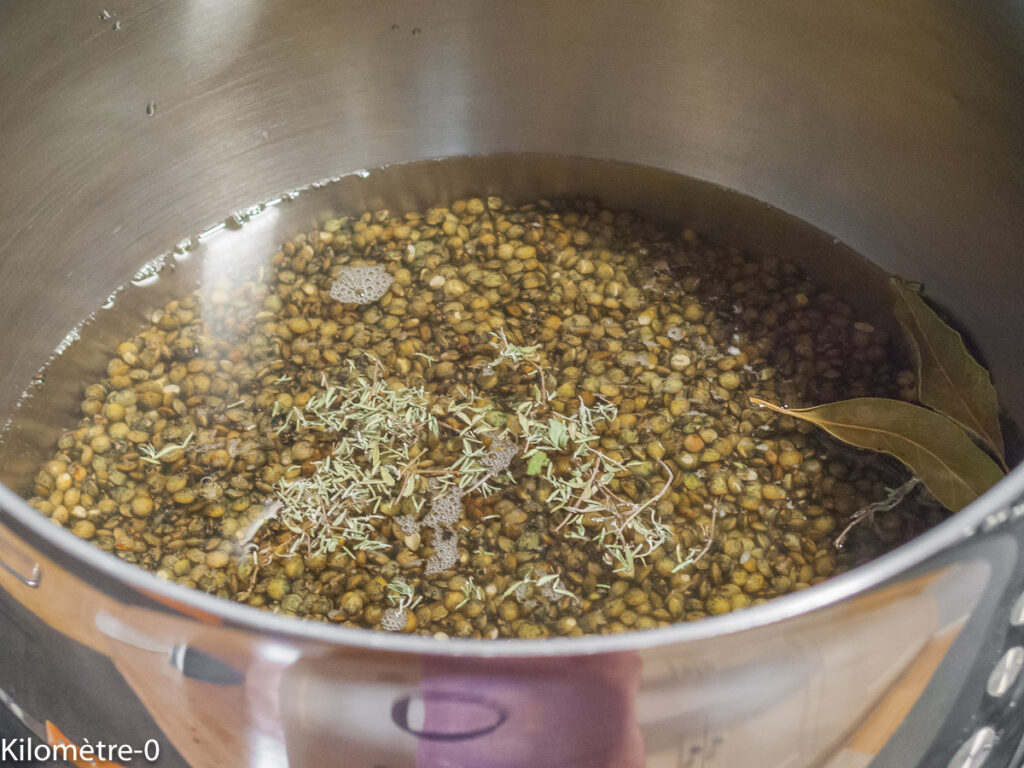 Pendant la cuisson des gésiers, cuisez les lentilles dans de l’eau froide avec du thym et deux feuilles de laurier.