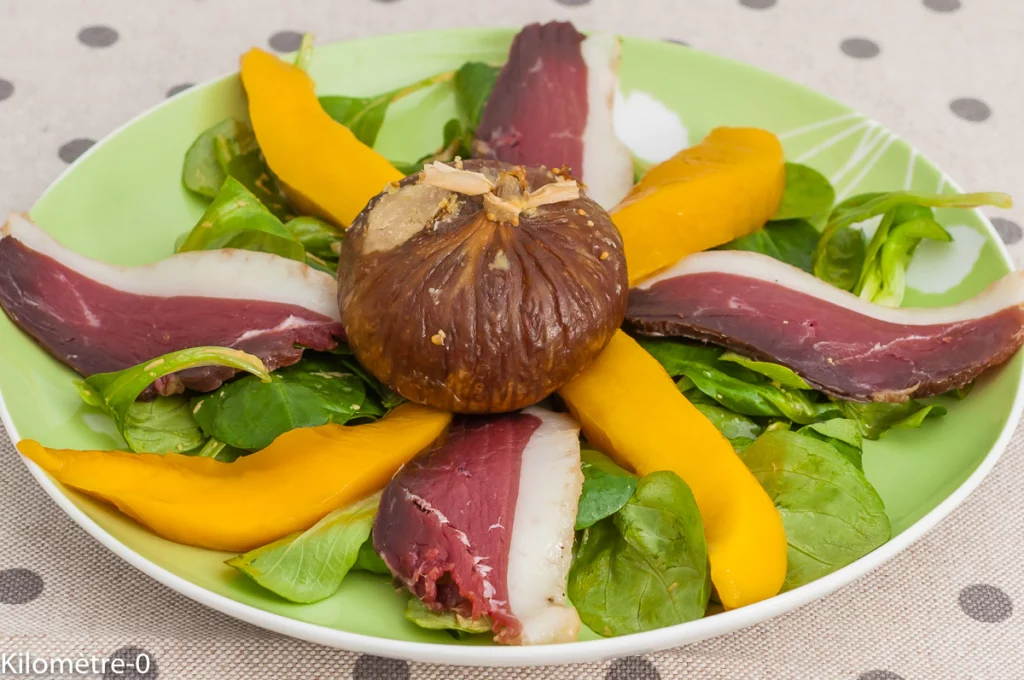 Salade de magret séché de canard à la mangue et figue au foie gras - Recette Kilomètre-0