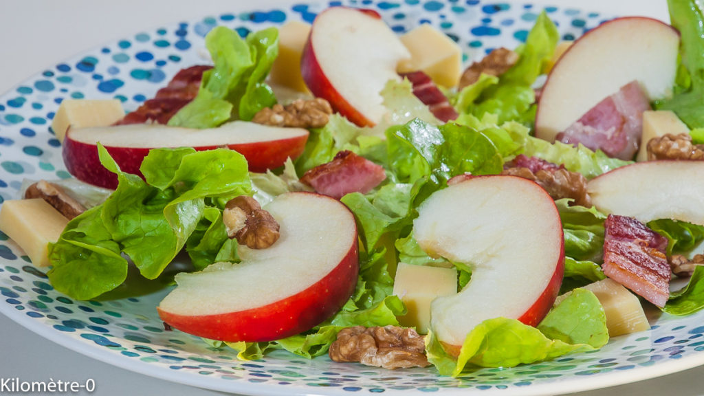 Coupez la pomme en lamelles et le comté en dés. Déposez-les dans les assiettes