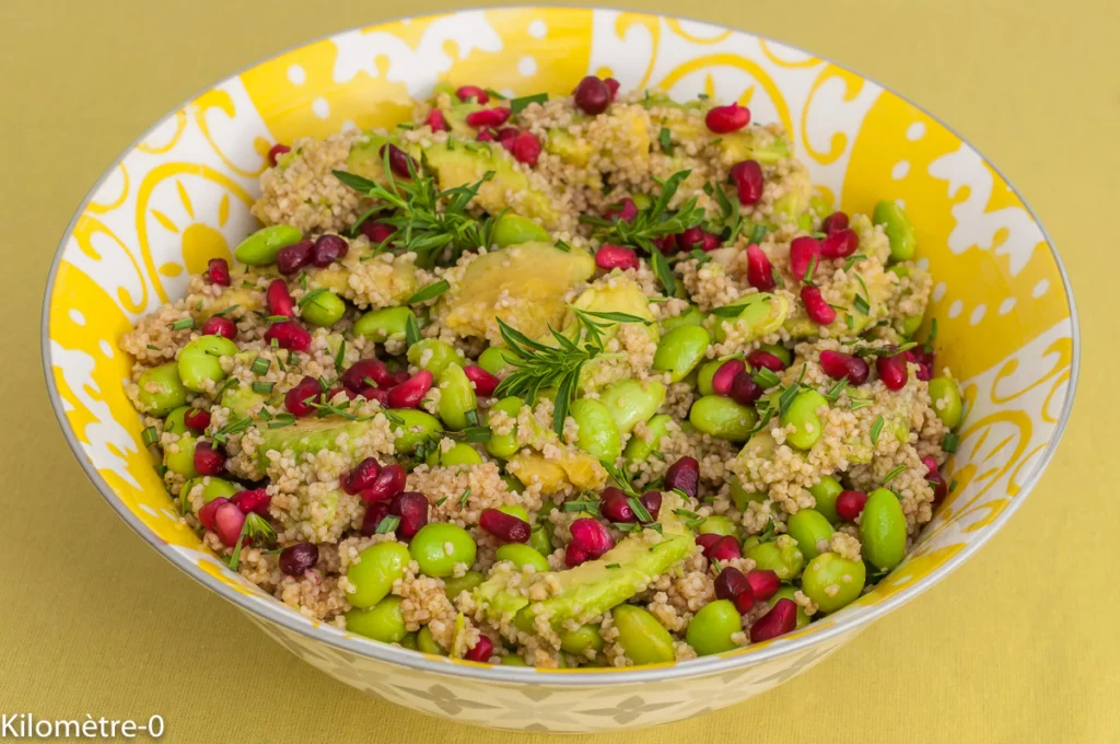 Salade de semoule d’épeautre aux fèves de soja edamame, avocats, grenade et sarriette - Recette Kilomètre-0