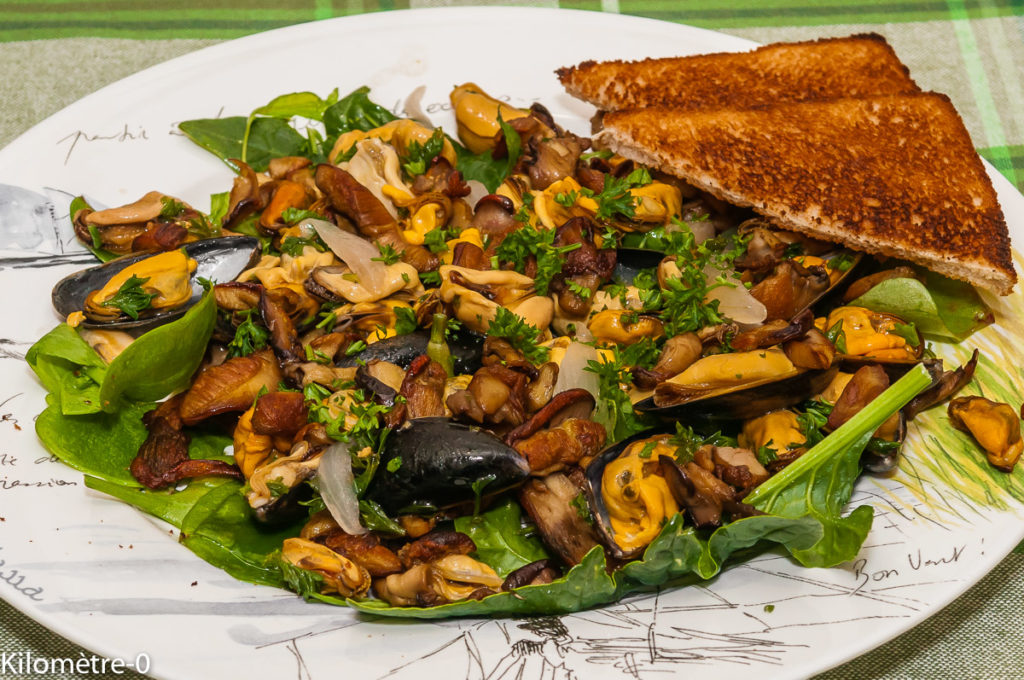 Dans les assiettes, déposez la salade, les moules et les cèpes. Parsemez de persil ciselé.