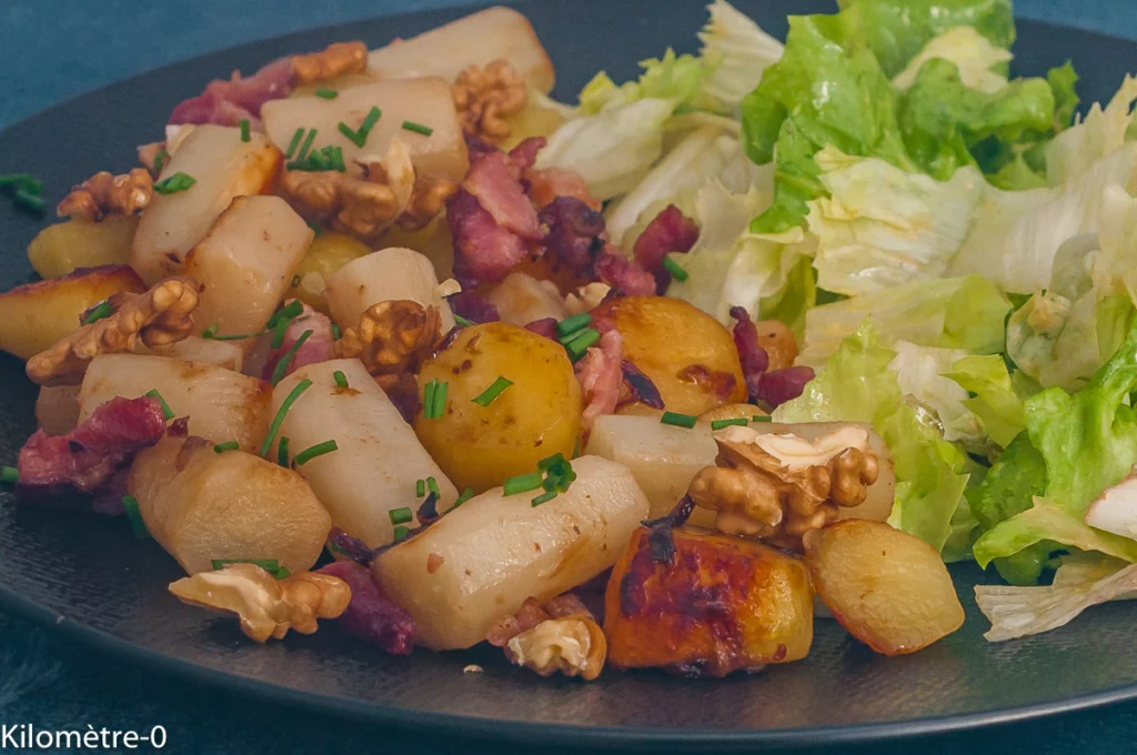 Scorsonères et pommes de terre sautées aux lardons et aux noix