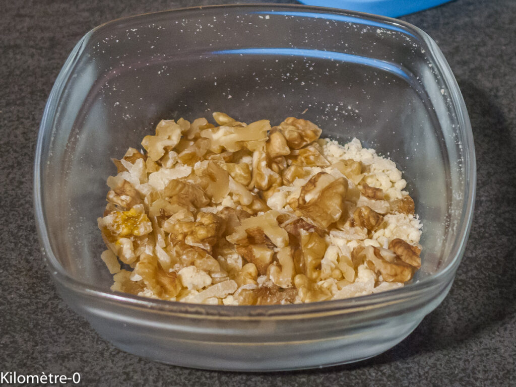 J’ai mis pour ma part un reste de noix concassées mélangées avec du parmesan. Le fromage ne peut que rajouter de la gourmandise^^.