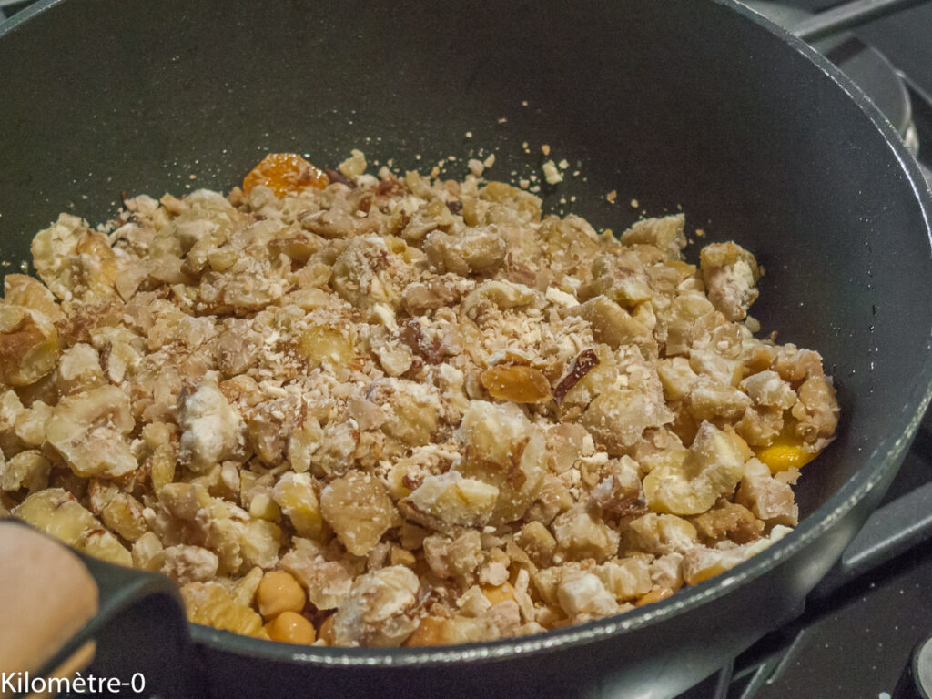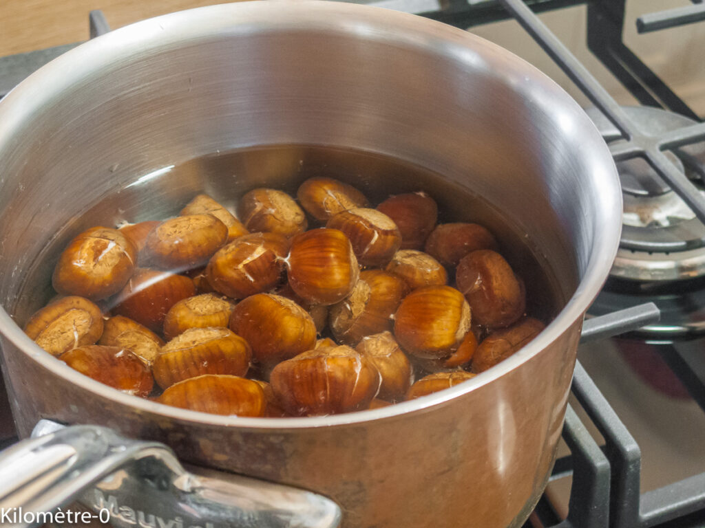 J’avais vu deux méthodes : celle de Kekeli qui invite à les cuire toutes entière, à les couper ensuite et à les mettre dans un presse ail et la technique classique qui consiste à les éplucher. J’ai mixé les deux techniques car si en prévision de l’épluchage, j’avais acheté un bon presse ail, il était un peu étroit pour faire rentrer mes grosses châtaignes.
