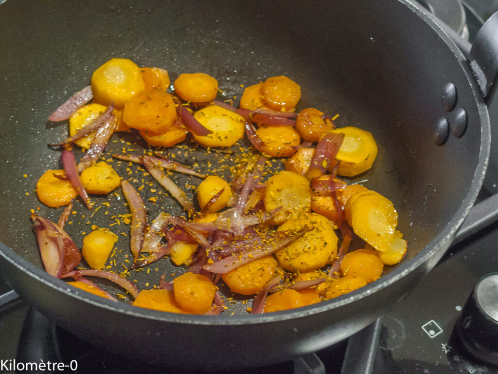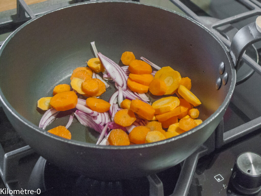 Dans une poêle profonde ou dans une casserole, faites cuire dans de l’huile un oignon épluché et détaillé en lamelles ainsi que les trois carottes épluchées et coupées en rondelles.