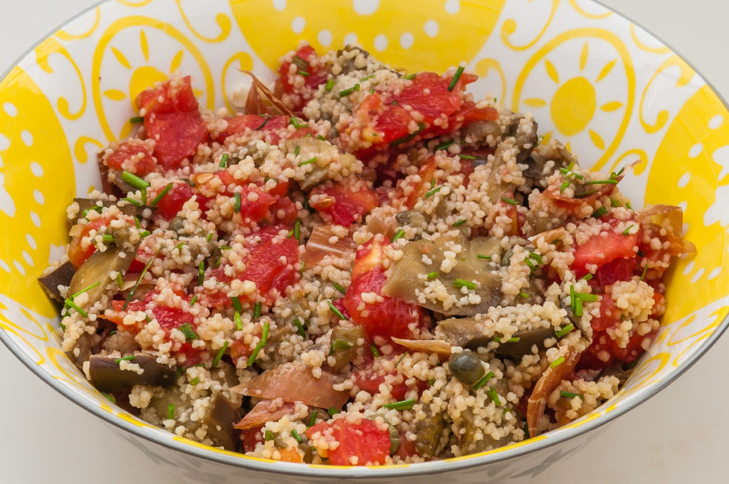 Préparez la vinaigrette. Versez-la sur les aubergines et la semoule mises dans un saladier. Ajoutez les dés des tomates pelées, le jambon sec, les câpres et la ciboulette ciselée.