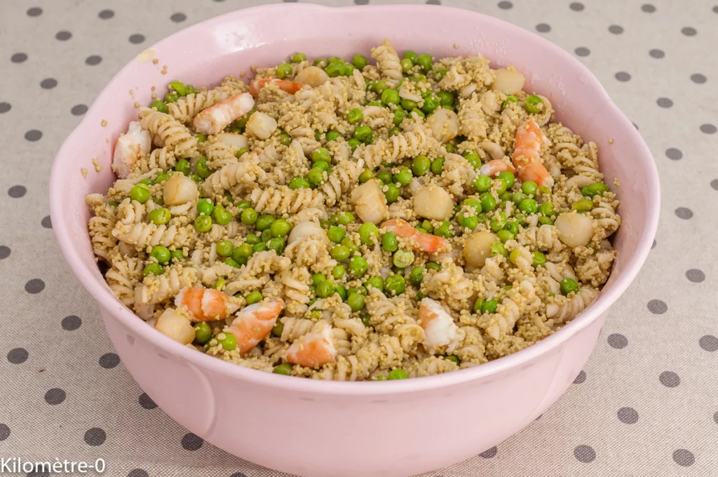 Taboulé aux pois cassés, aux pâtes, petits pois, crevettes et pétoncles - Recette Kilomètre-0