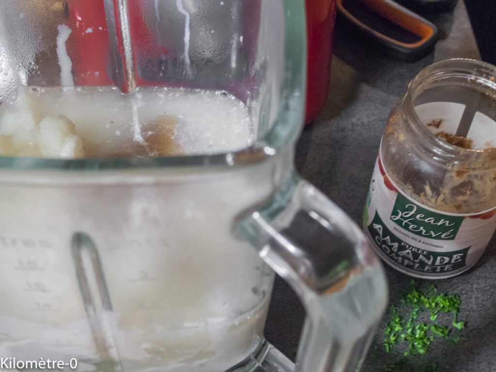 Versez le contenu de la casserole dans un blender avec le lait d’amandes, la purée d’amandes.